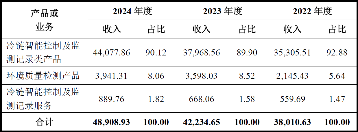 对于一类核心业务冷链设备智能控制器及监测记录类硬件产品,发行人将其细分为冷链智能控制类产品、多源感知冷链监测记录产品、制冷热泵检测仪表三种,其分别占主营收入的平均比例依次为41.82%、27.75%、21.40%,因冷链智能控制类产品收入占比近半,为发行人核心业务中主力。