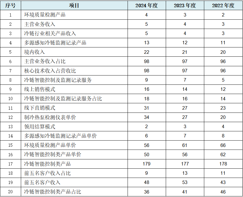 从上表可见,发行人首先出现主营业务收入及占比数据规律性变化,在此之下三大业务均涉收入数据规律性变化,其中核心业务冷链设备智能控制器及监测记录类硬件产品项下三类产品中,涉冷链智能控制类产品及多源感知冷链监测记录产品两大类重要产品收入数据规律性变化,叠加全冷链行业相关产品收入、线上收入、线下收入、前五名客户收入、境内收入等多项重要直接数据规律性变化,以及多项核心收入占比间接数据也出现规律性变化。此外发行人还出现了诸如冷链智能控制类产品单价的几乎全硬件产品的销售单价数据的规律性变化。因此发行人主营收入存在人工干预的痕迹可能相当明显。