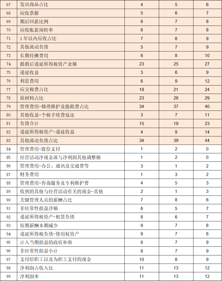 就资产负债类数据而言,发行人存在应收账款及期后回款比例类关键数据规律性变化,与前文主营业务收入数据规律性变化能够形成数据上关联关系,而固定资产大类数据、多项递延所得税资产数据及大量负债率类数据甚至是多项所有权权益数据的规律性变化,几乎覆盖了资产负债表的多个方面。此外资产总计及负债合计、负债和所有者权益总计三项会计等式数据的规律性变化,则可能说明发行人资产负债表经过总体部署的概率也较高。