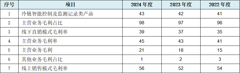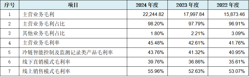 从上表可见,与主营业务收入数据规律性变化相同的是,发行人主营业务毛利额及占比数据出现规律性变化,且递进至主营业务毛利率数据也同样出现规律性变化。构成主营业务毛利率核心的冷链智能控制及监测记录类硬件产品的毛利率也出现数据规律性变化,叠加收入占比95%左右的线上销售、线下直销两业务模式的毛利率数据同步规律性变化,发行人出现多项关键性盈利数据或指标出现规律性变化。也即发行人在以主营业务毛利额及毛利率为代表的盈利能力上,首先表现出可能存在真实存疑的问题。