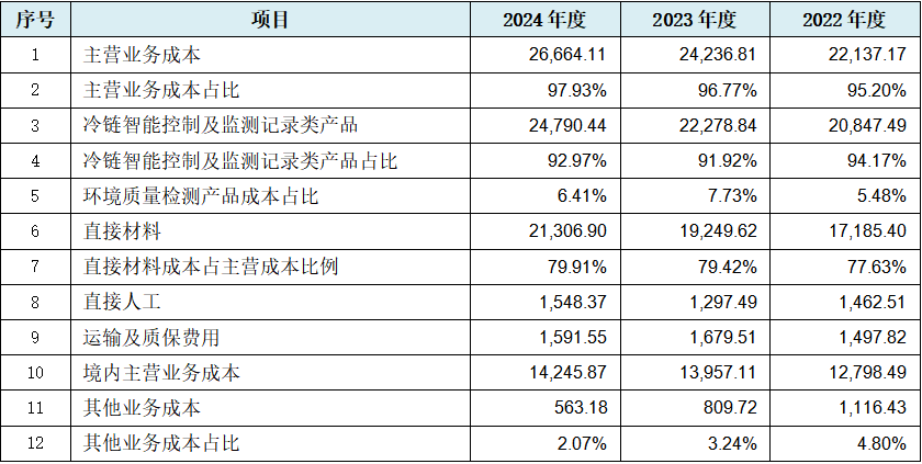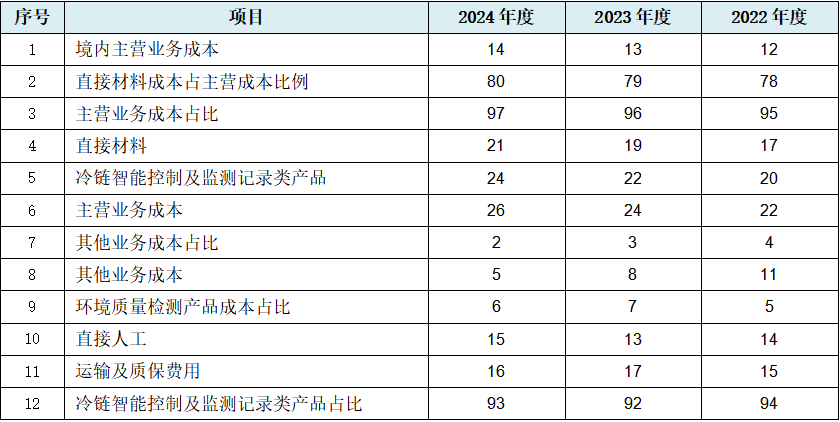 从上表可见,与主营业务收入、毛利、毛利率数据规律性变化也相同的是,发行人主营业务成本数据首先出现较为严格的规律性变化,即每年稳定增加2,000万元左右。而主营业务成本之下的核心业务冷链智能控制及监测记录类硬件产品继续出现成本数据的规律性变化,其与环境质量检测产品同时出现成本占比间接数据的规律性变化。从成本要素三分类的角度而言,发行人出现直接材料及直接人工成本数据的规律性变化,仅制造费用未涉,但运输及质保费用也出现数据规律性变化。而其他业务成本及占比数据的规律性变化,作为主营业务成本数据规律性变化的补充,共同构成发行人主营业务成本大项数据的规律性变化。至于境内主营业务成本直接数据规律性变化,则可能说明发行人在境内成本的管理上更具“管控力”。以上12项成本数据的规律性变化,可能综合说明发行人成本数据的真实性存在较高疑问。