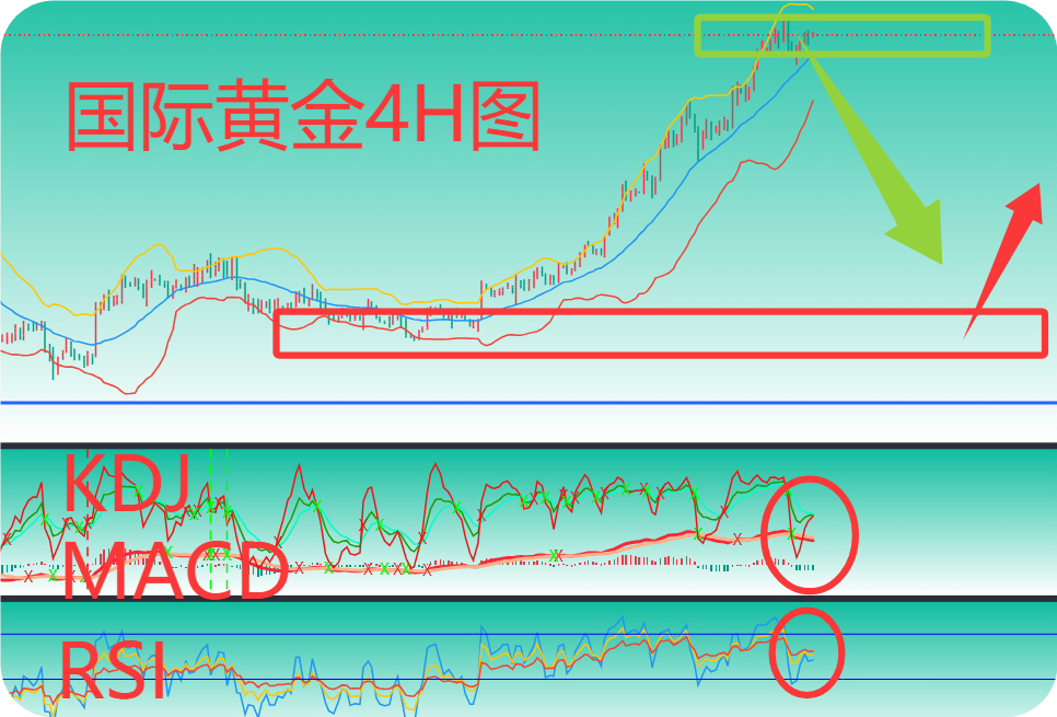 :4小时级别上:布林带运行开口收窄,金价在布林带中轨上方运行;MACD 技术指标死叉运行中,RSI 技术指标超买回落状态中;