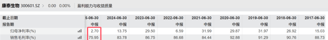 盈利能力的下滑也十分明显。2025年上半年,公司毛利率仅为76%,净利率仅为2.7%,均为近九年同期最低。