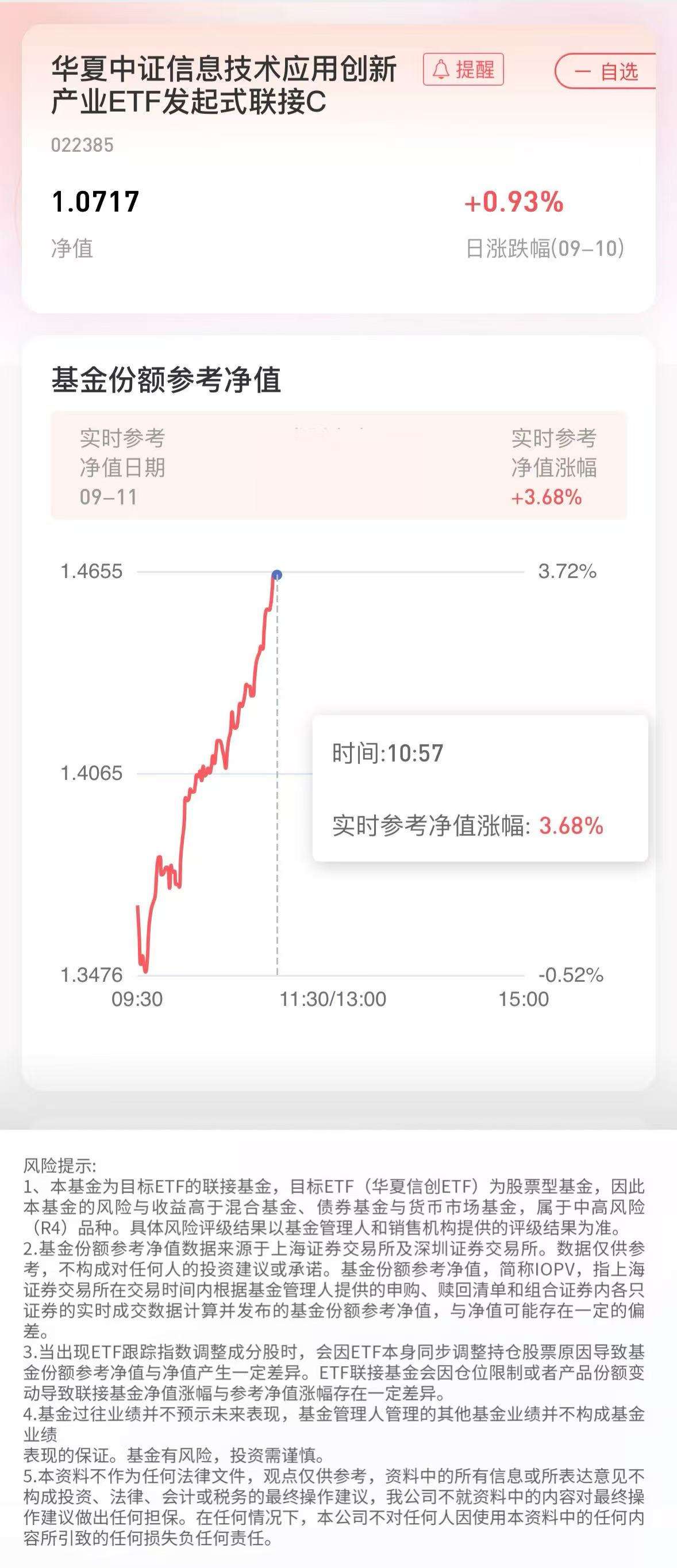 截止至2025年9月11日10:57,本基金跟踪目标基金的实时参考净值涨幅为3.68%。