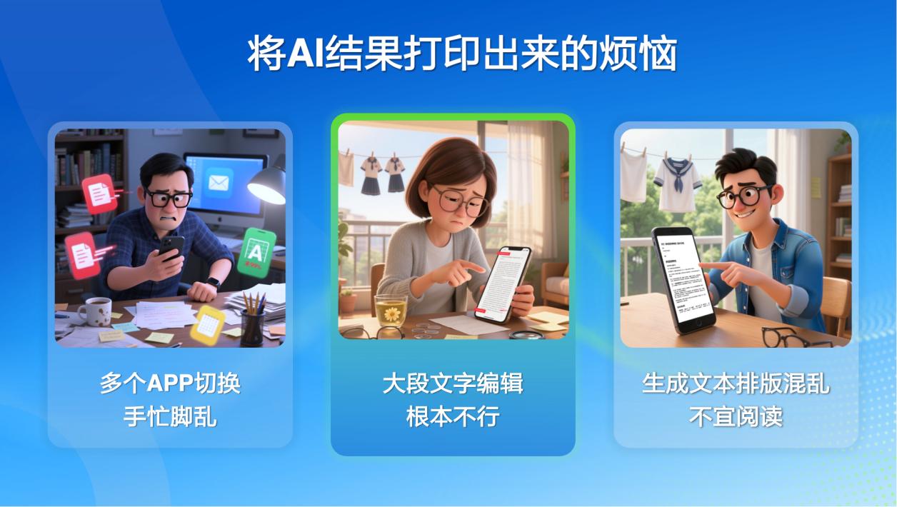 “我家孩子上三年级,每天要做口算,每周要写作文,批改口算、修改作文都要耗费家长大量的时间,还要逐字找错、想改写建议。后来用了AI软件,虽然改得快了,但为了不让孩子对屏幕产生依赖,同时也保护好视力,我就想把批好的内容打印出来,可有时仅调整格式就要耗费很长时间。”发布会上,家庭教育指导师、40万粉丝小红书教育博主@我叫小豆浆讲述了辅导孩子作业时遇到的困境。这些看似细碎的烦恼,是千万中国家庭的共同写照——家长既想借助AI提升辅导效率,又担心屏幕对孩子视力和专注力的影响;好不容易平衡了效率与健康,却又被“格式调整”最后一步绊住脚。