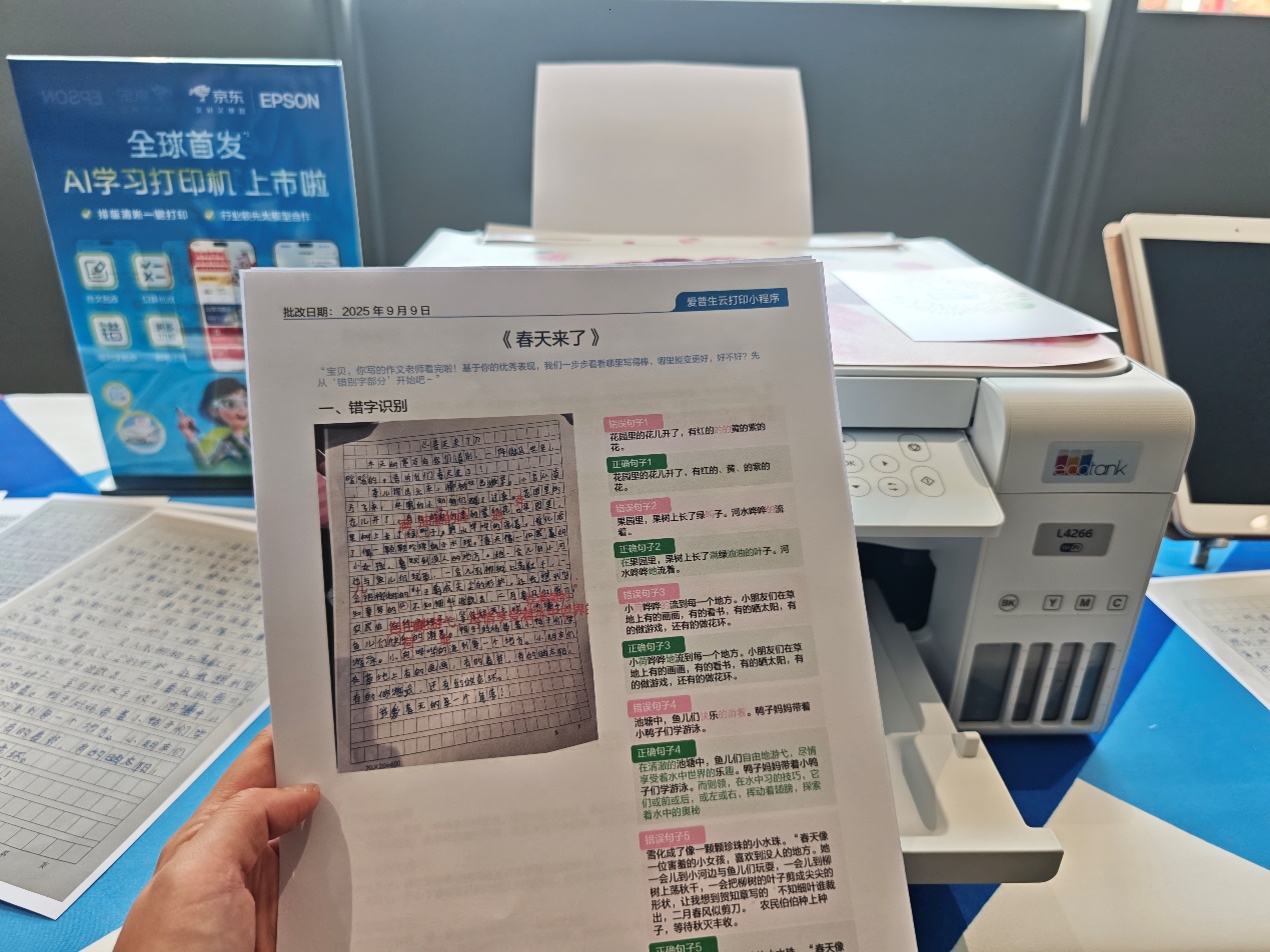 如何解决这些痛点,让辅导作业不再“鸡飞狗跳”?9月9日举行的爱普生与京东“AI学习助手”暨全球首发AI学习打印机发布会上,AI批改作文批改、口算、错别字三大功能首次发布,通过创新的“AI+打印”模式,让学习回归纸张,用AI为纸张赋予智慧。不仅精准击中了“AI辅导屏幕依赖”“打印操作烦琐”等当下家庭教育中的核心痛点,而且重新定义了家用打印机在智慧教育场景中的角色。