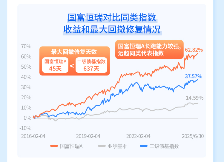 以国富恒瑞为例,作为一只典型的“固收增强”产品,成立于2016年,净值走势始终稳中有进,陪伴投资者穿越市场的“潮起潮落”。国富恒瑞A成立以来不仅长跑能力卓越,大幅跑赢业绩基准与同类代表指数,更以45天修复最大回撤的优异表现,带来远超同期同类指数的投资体验。