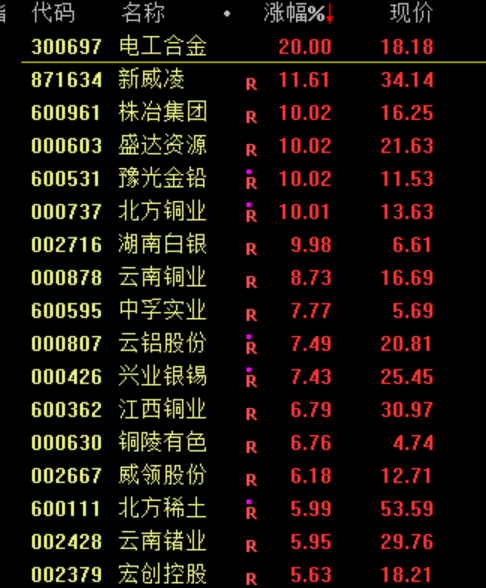 有色板块集体走强,北方铜业、盛达资源等封板。