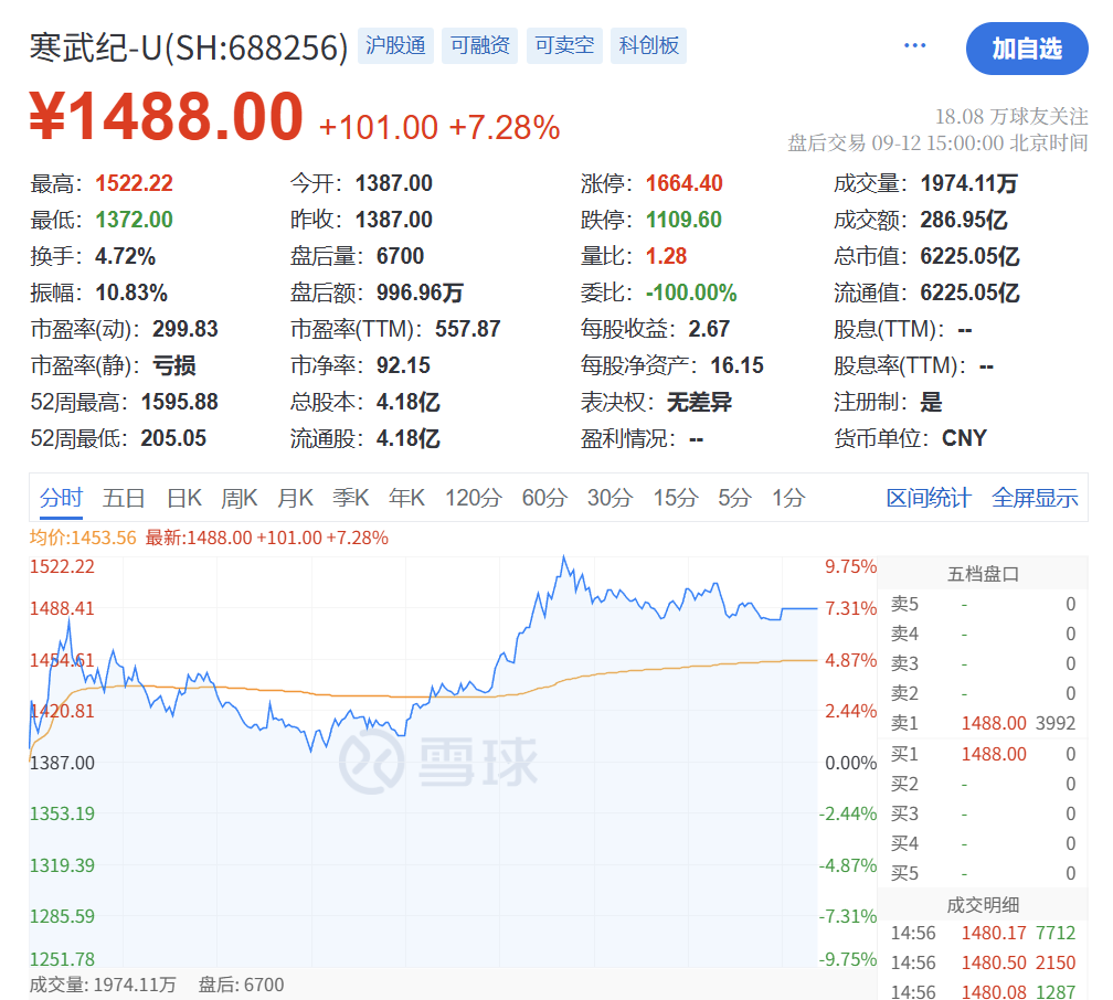 算力芯片龙头寒武纪一度涨超9%,股价突破1520元,反超贵州茅台,重夺“股王”宝座。但到了收盘时候,股价略有回落。
