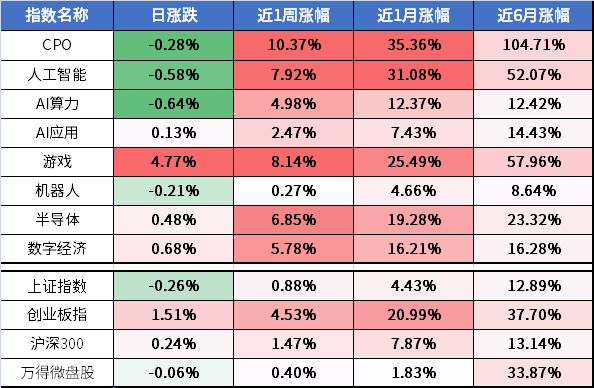 今日科技板块上涨乏力,具体来看,芯片产业链整体高开低走,午后存储芯片出现短暂回流,锂电池产业链在龙头带动下保持活跃,CRO概念加速回升,游戏股涨势不俗,下跌方面,AI硬件端陷入调整。中长期来看,政策支持下,科技行业景气预期强化,A股“科技叙事”逻辑有望支撑行情持续深化。相关细分产业指数近期表现如下: