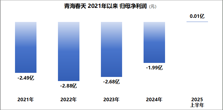 2025年,听花酒背后的母公司——青海春天因经营问题,股票名称变更为*ST春天。公司在上半年发布的财报中显示,其盈利状况极为惨淡。报告期内,公司仅实现营业收入1.25亿元,同比减少9.76%;虽实现净利润131.70万元,看似扭亏为盈,但这一利润数额甚至不及一线城市一套房子的价值。而更能反映公司真实经营情况的扣非净利润,则显示为亏损178.77万元。