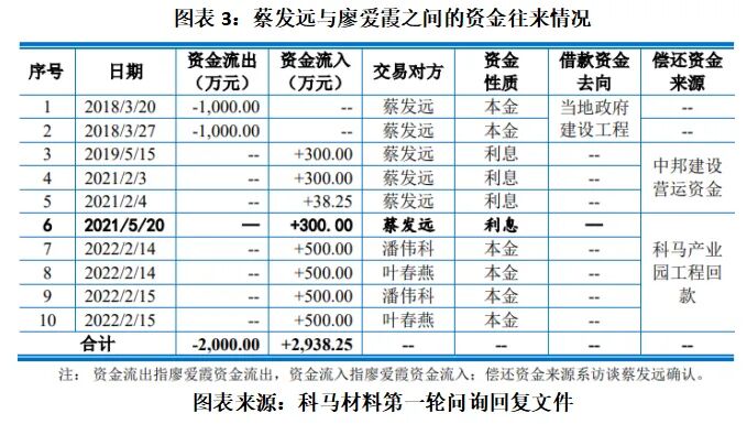 作为中邦建设的实控人,蔡发远还曾于2018年3月向科马材料的实控人廖爱霞借款2000万元。2022年以后,蔡发远由于资金压力较大,未再继续支付借款利息,并于2022年2月通过中邦建设员工叶春燕、潘伟科归还2000万元本金,资金来源同样为科马产业园工程回款。