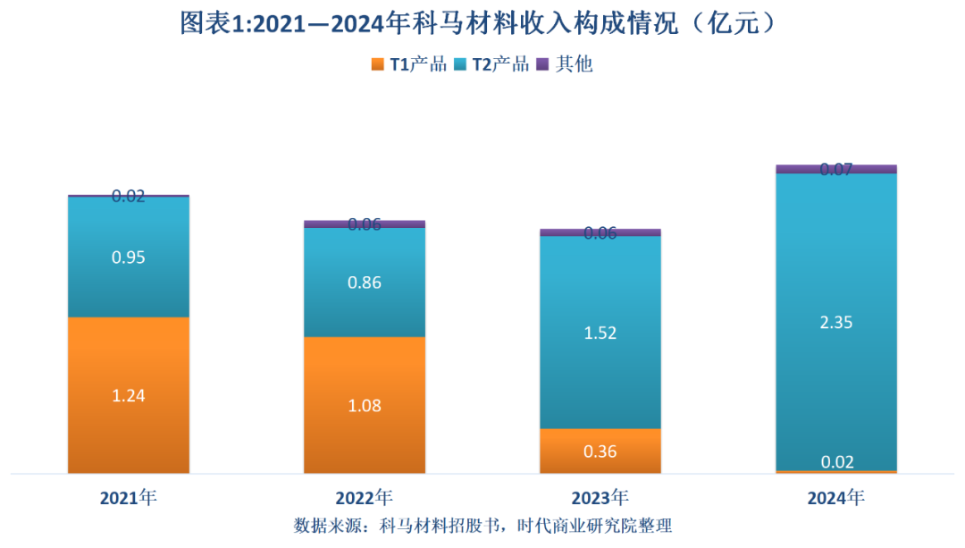 报告期内,科马材料的T1产品陷入停产,收入占比一度接近“归零”。