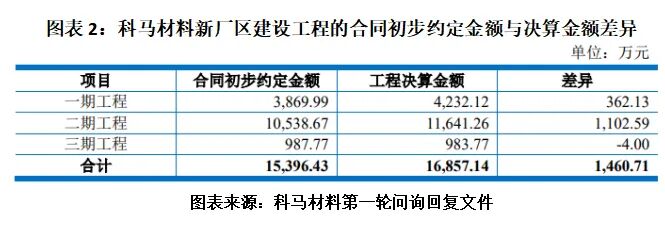 不过,第一轮问询回复文件显示,科马材料新厂区建设工程的合同初步约定金额合计为1.54亿元,而实际决算金额为1.69亿元,比预算金额高1460.71万元。其中,科马材料向中邦建设采购的建筑工程服务金额为1.28亿元,占比约76%。