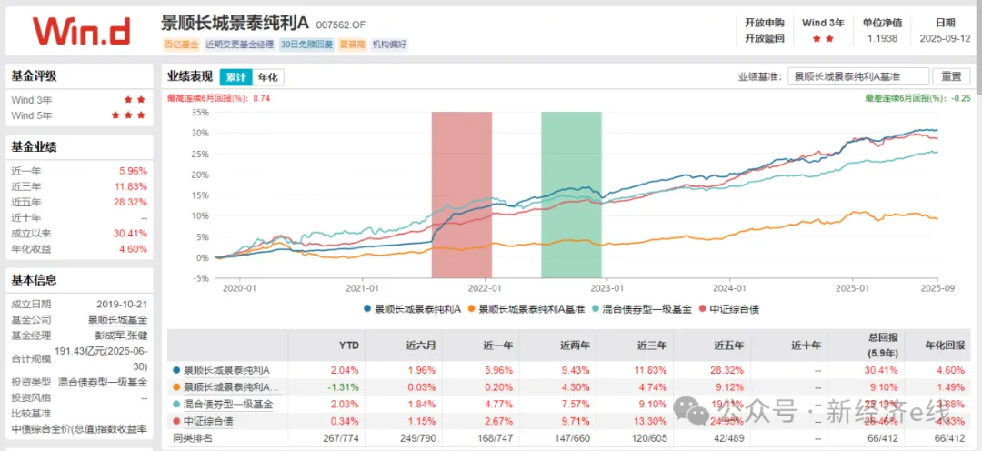 Wind统计显示,截至2025年9月12日,景顺长城景泰纯利A自2019年10月21日成立以来,基金总回报为30.41%,同期业绩比较基准累计收益率9.10%,基金实现超额收益21.31%。