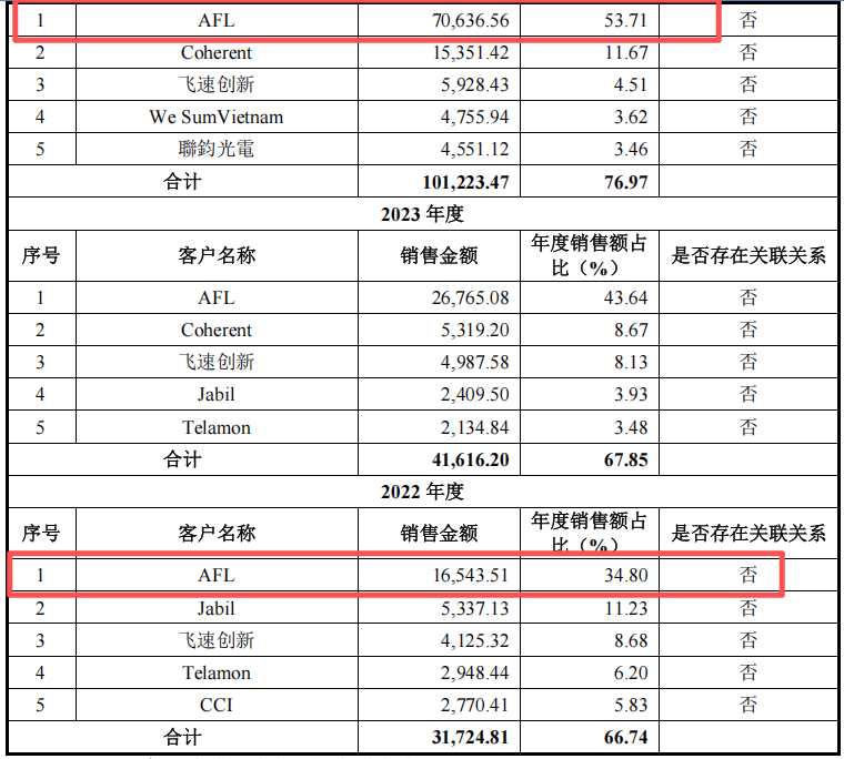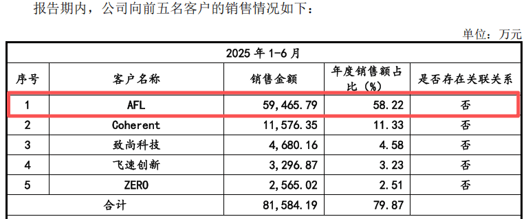 蘅东光存在明显的大客户依赖症。2025年上半年,公司前五大客户销售占比近80%,其中第一大客户AFL独占58.22%。