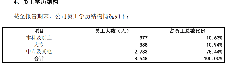 公司员工学历结构也反映了这一问题。本科及以上员工人数占比仅10.63%,中专及其他学历占比高达78.44%。人才结构短板可能制约企业创新发展能力。