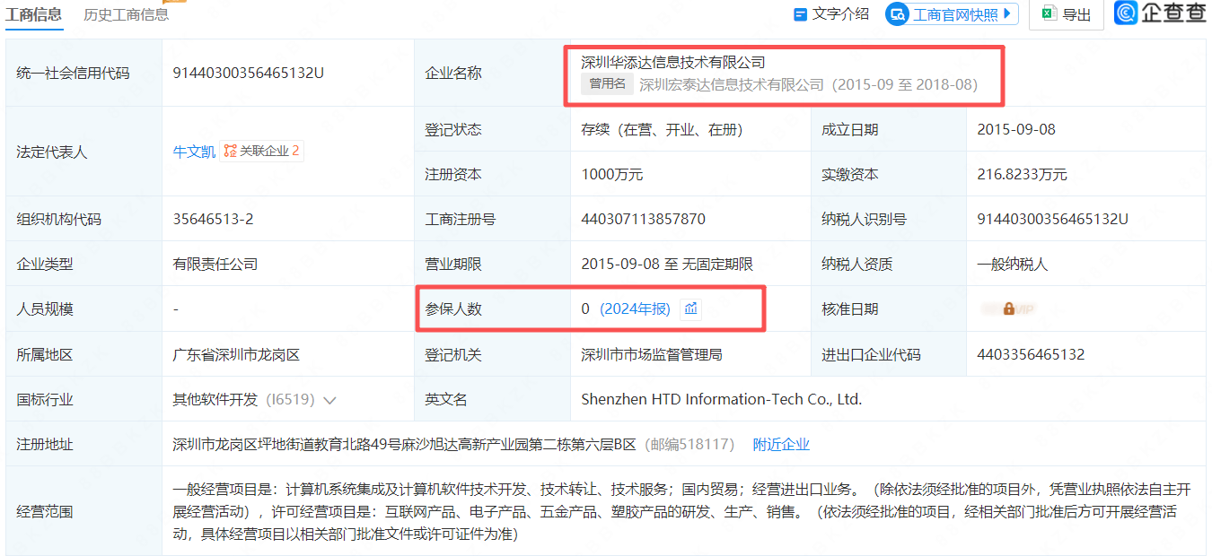 蘅东光主要供应商深圳华添达信息技术有限公司员工参保人数为0人。