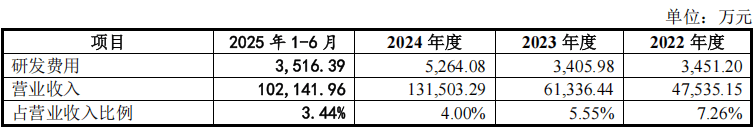 作为一家科技企业,蘅东光的研发费用率却不升反降。2022年至2024年,公司研发费用分别为3451.20万元、3405.98万元和约5264.08万元,研发费用率分别为7.26%、5.55%和4%。
