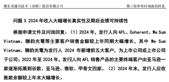 北交所在二轮问询中直接质疑蘅东光收入大幅增长的真实性。2024年,公司向AFL销售金额增长幅度远高于客户自身收入增长幅度。