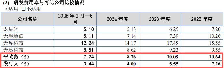 相比之下,同行可比公司研发费用率均值分别为10.64%、10.08%和8.76%,蘅东光的研发投入强度远低于行业水平。