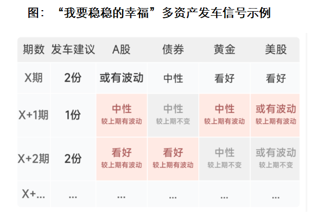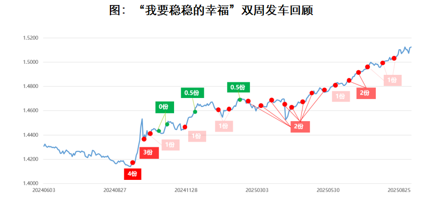 在风险资产位于阶段性“低位”的区间里,我们给出了3份、甚至4份较多份数的发车建议。比如我们在2024年9月19日,国内股市处于高性价比投资区域,我们权益资产估值和技术层面的双指标模型提示增加份数,给出了“我要稳稳的幸福”发车4份的信号。