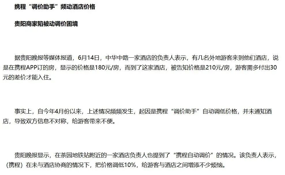 携程的私自调价行为给酒店带来了诸多麻烦。贵阳中华中路一家酒店的负责人表示,酒店定价明明是210元/房,而携程“调价助手”偷偷把价格改成180元/房,并未通知酒店。