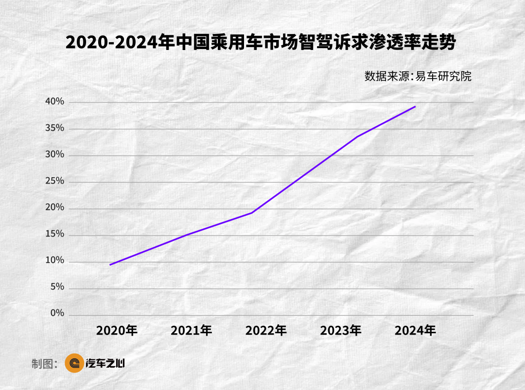 咨询机构 J.D.Power 的报告指出,消费者购车决策中「智能驾驶功能」的权重,从 2020 年的 12%,涨到 2023 年的 35%。易车研究院发布的购车决策洞察报告则显示,2024 年这个数字已接近 40%。
