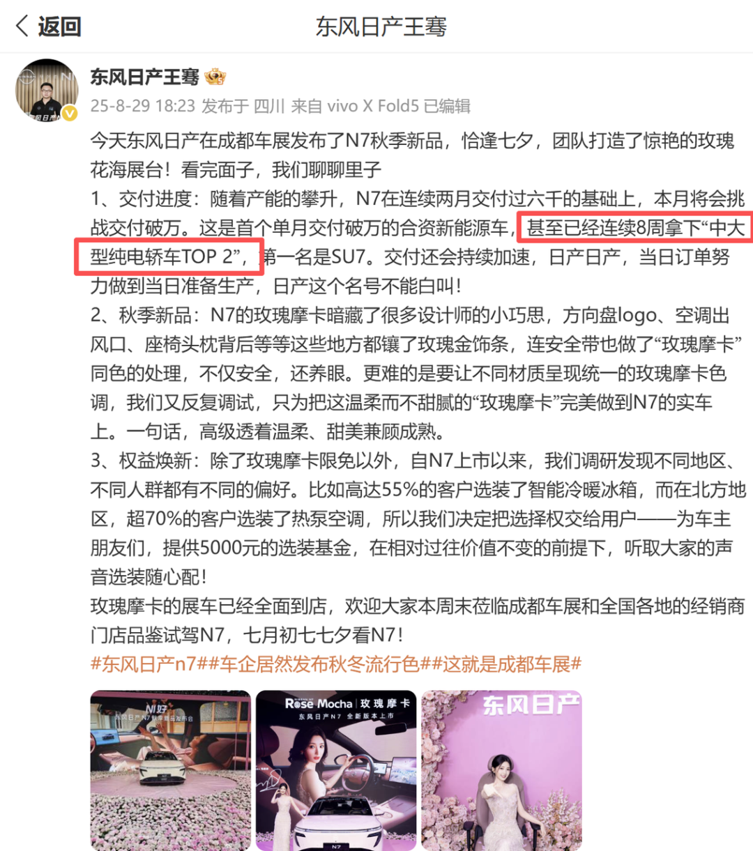 东风日产新能源品牌总经理王骞在微博上写道:「已经连续 8 周拿下中大型纯电轿车 TOP 2,仅次于小米 SU7。」对一家合资车企而言,这一成绩的意义不言而喻。