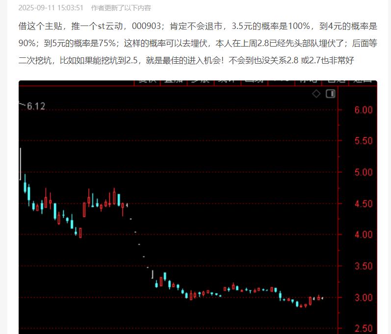 1,000903马上买也不会马上涨,而是在未来的10个月之内,站上3.5的概率是100%,上4元的概率是95%;上5.8元的概率是75%,逻辑就是:a,云动是有技术和营收的;b,云动很多概念加身,c,不会退市;d,摘帽的概率是100%,为什么?因为别人造假是虚增业绩,云动这奇葩造假是隐藏利润1亿多元!e,被st之后,暴跌50%,成为低位股,摘帽涨个30%不过分吧,何况,用st戴帽洗走那么多散户。筹码被人在低位收走,不涨对不起有心人啊!
