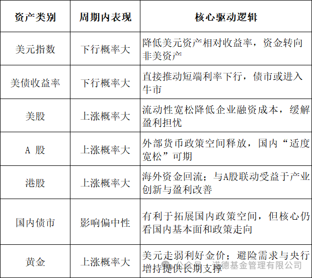 预防式降息主要通过“流动性宽松”与“风险偏好提升”推动各类资产重估,对各类资产的具体影响如下表所示。