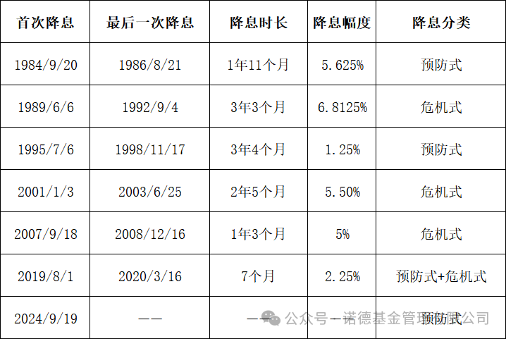 一类是在经济增长放缓但未出现明显问题的情况下,提前进行降息以预防风险的发生,属于预防式降息,如1984、1995、2019年的降息。