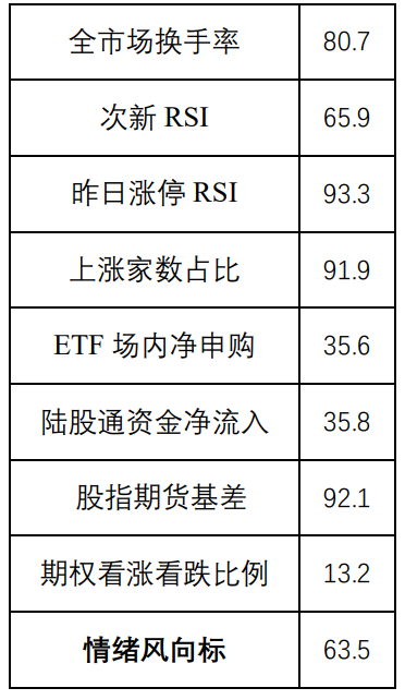 上一交易日市场情绪风向标的分值为63.5分,表明市场情绪偏高,未来短期有一定的上涨概率,但上涨空间有限。市场未来三个月情绪方向不明确,需关注情绪风向标是否持续高于60分。