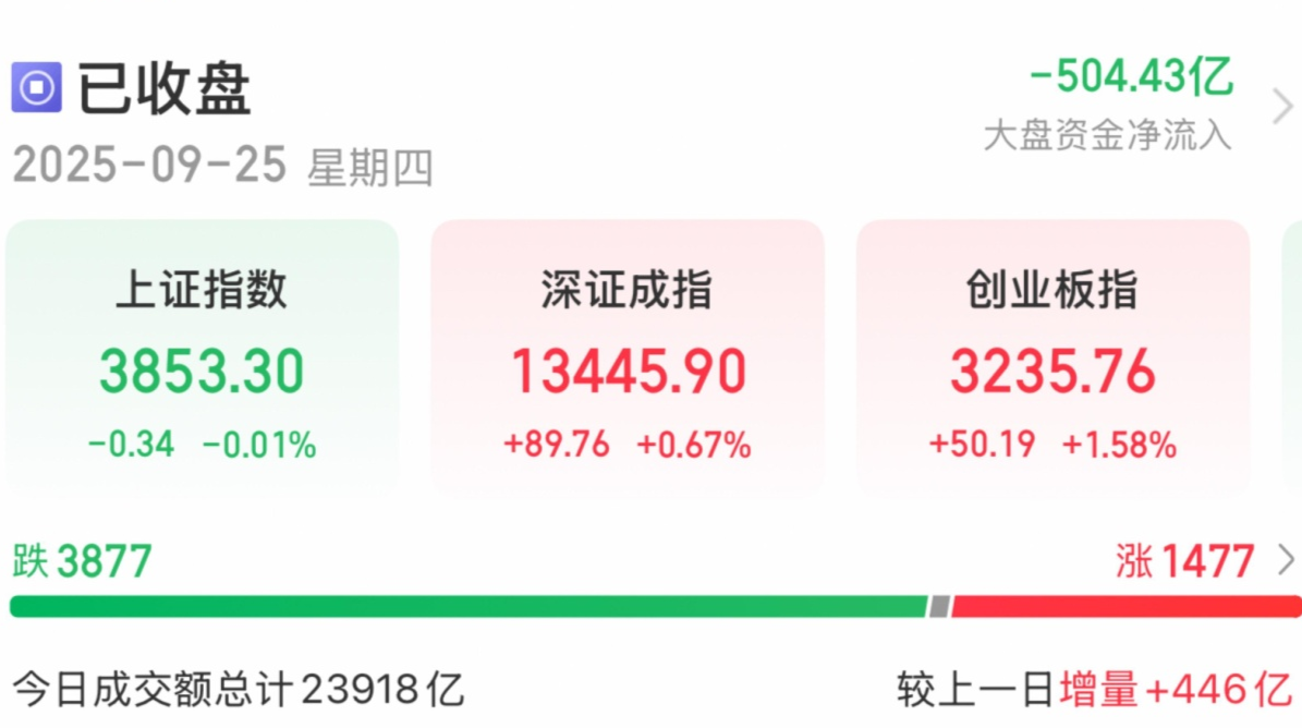 9月25日,三大股指涨跌不一,创指领涨。截至收盘,上证指数跌0.01%,深证成指涨0.67%,创业板指涨1.58%,北证50跌1.37%。全市场超3800只个股下跌。板块题材上,游戏、铜缆高速连接、可控核聚变、金属铜、影视院线、风电设备板块涨幅居前;贵金属、燃气、港口航运、油气开采及服务、工程机械、物流板块跌幅居前。