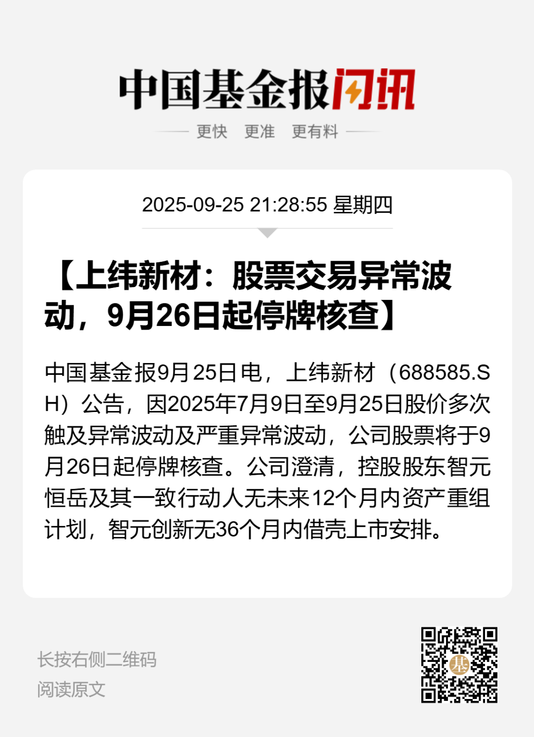 9月25日晚间,上纬新材发布公告称,7月9日至9月25日,公司股价多次触及股票交易异常波动及严重异常波动情形,并且最近两个交易日连续涨停,计划自9月26日开市起停牌,直到披露核查公告后复牌。
