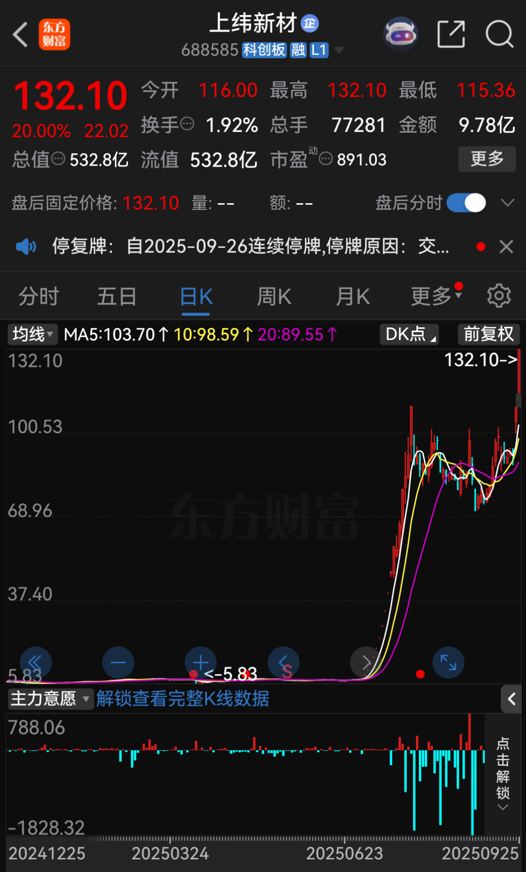 截至9月25日收盘,上纬新材股价报132.10元/股,涨幅达20%,总市值为532.8亿元。