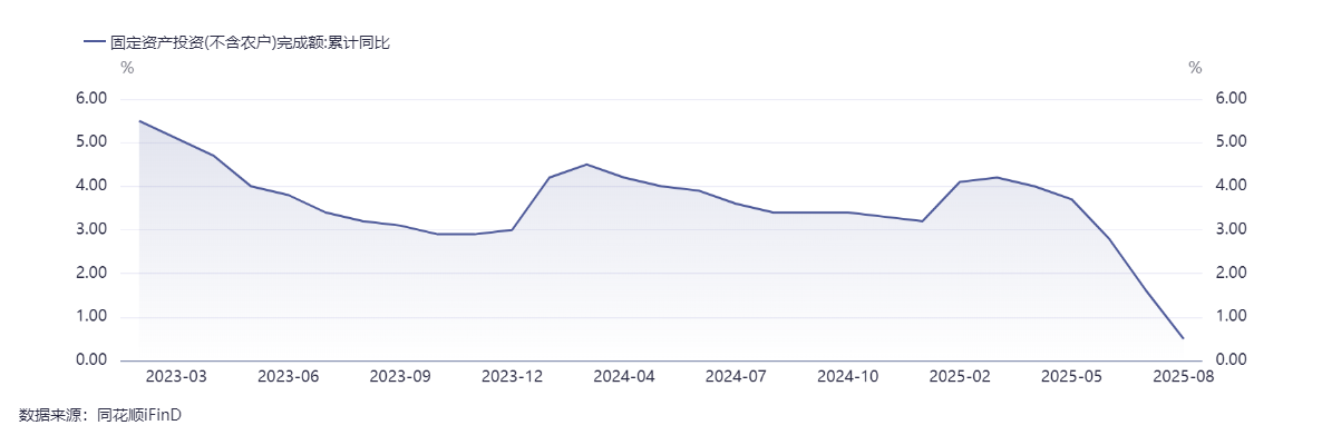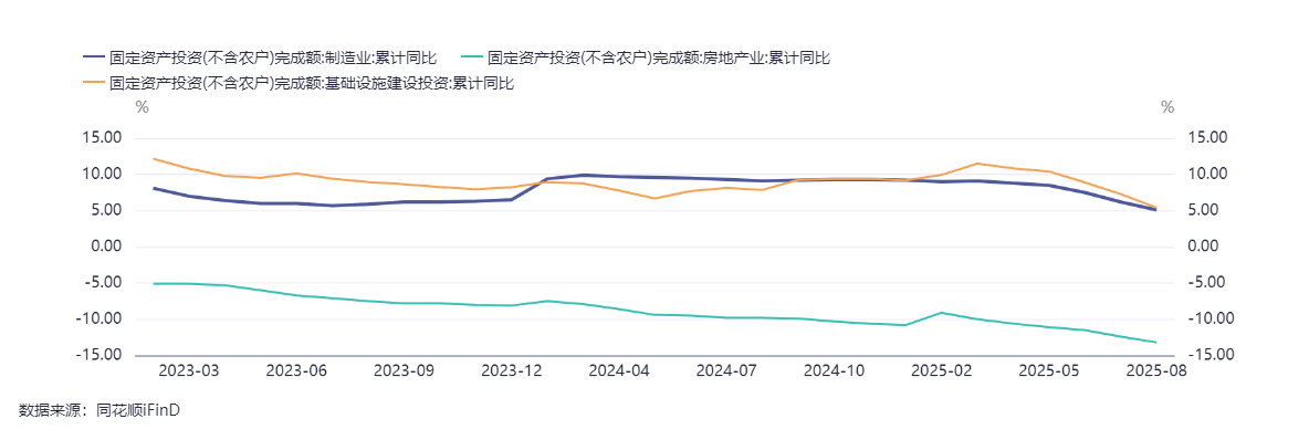 1-8月固定资产投资同比增长0.5%,与前值相比回落1.1个百分点,单月同比较前值进一步下降。三大分支均对固定资产投资造成拖累。地产投资进一步下行,制造业投资和基建投资高位回落,房地产行业的资本开支仍然显著慢于经济的修复。