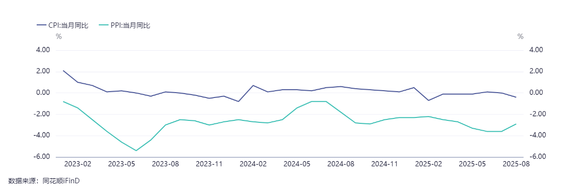 8月份,全国居民消费价格同比-0.2%,弱于预期和前值。工业生产者出厂价格同比下降2.9%,基本符合预期且强于前值。