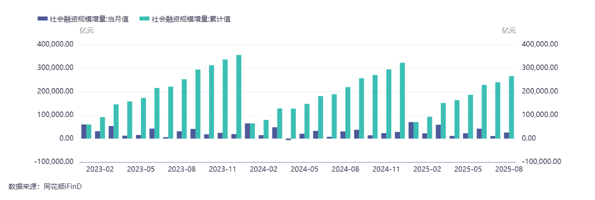 8月社融新增2.57万亿元,同比少增0.46万亿元,基本符合市场预期。实体信贷和政府债券均同比少增,主要由于经济景气度仍然偏弱、商品房成交面积仍处低位、化债带来净偿还效应。8月信贷增加0.59万亿元,同比少增0.31万亿元,低于市场预期和季节性规律。其中居民短期贷款增加0.01万亿元,同比少增0.06万亿元,表明居民消费转弱,主要由于此前的补贴政策、以旧换新政策在一定程度上消耗了居民消费需求。居民中长期贷款增加0.02万亿元,同比少增0.1万亿元,与房地产销售数据走弱趋势保持一致。企业短期贷款增加0.07万亿元,票据融资同比增长0.05万亿元,冲量特征有所放缓。中长期贷款增长0.47万亿元,同比少增0.02万亿元,表明企业投资意愿仍然偏弱。政府债券增加1.37万亿元,同比少增0.25万亿元,政府债后续对社融的支撑或逐渐放缓。