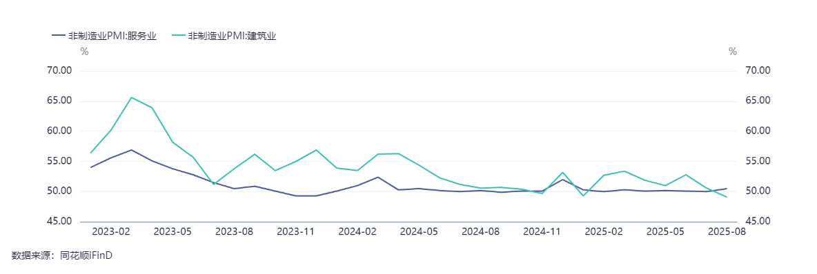 8月服务业PMI为50.5,回升0.5个百分点,整体看强于季节性。在暑期假日因素影响下,铁路运输、广播电视等行业景气度较高,此外股市表现带动资本市场服务景气度走强,但房地产对PMI拖累较为明显。建筑业PMI指数为49.1%,大幅回落1.5个百分点,主要由于高温和暴雨天气对建筑业施工进度带来一定影响。