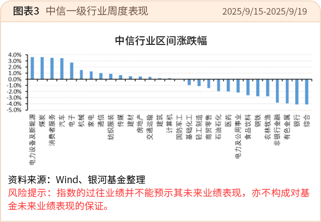 上周,受获利盘资金流动影响,市场波动有所加大。板块资金出现一定调整,军工行业表现相对较弱;前期涨幅较快且短期获利盘较多的TMT板块市场成交量及市场情绪未能进一步提升,非银金融板块方面,美国8月就业数据表现欠佳叠加美联储主席发表偏鸽派言论,在此背景下,黄金价格创下新高,有色金属行业表现持续偏强。低位成长板块因高低切换资金的流入而表现较突出,如电力设备新能源板块。