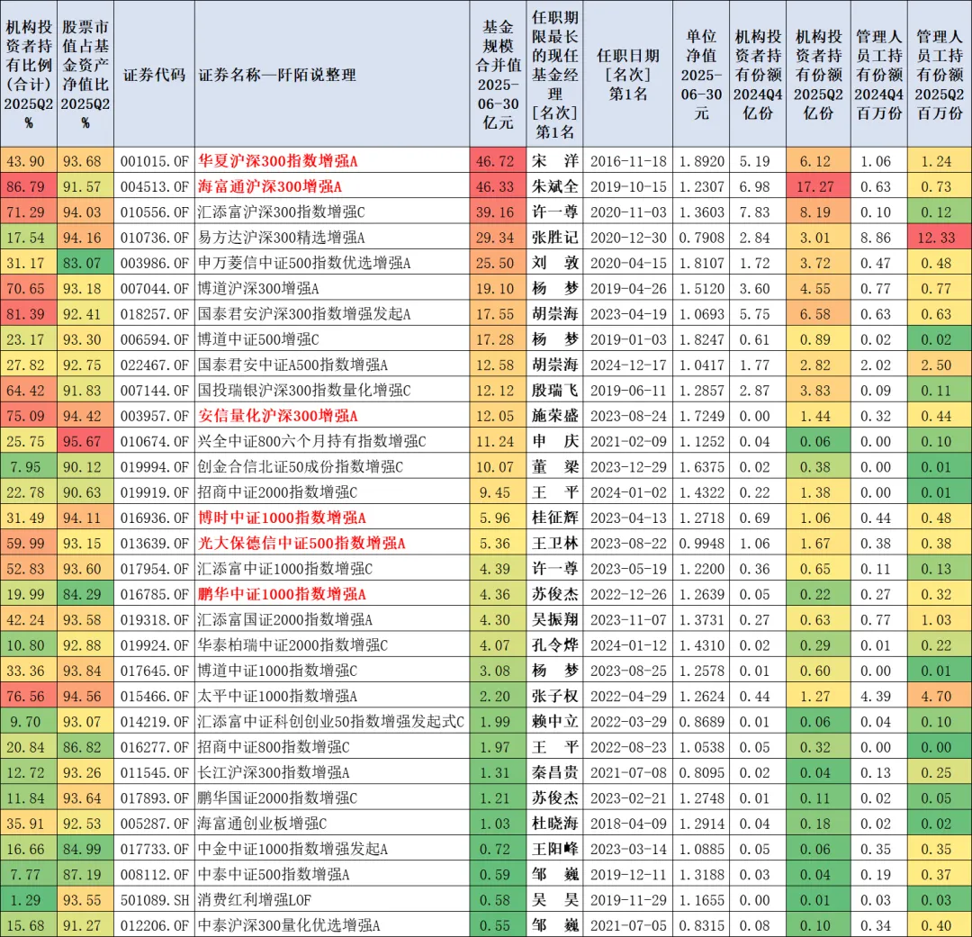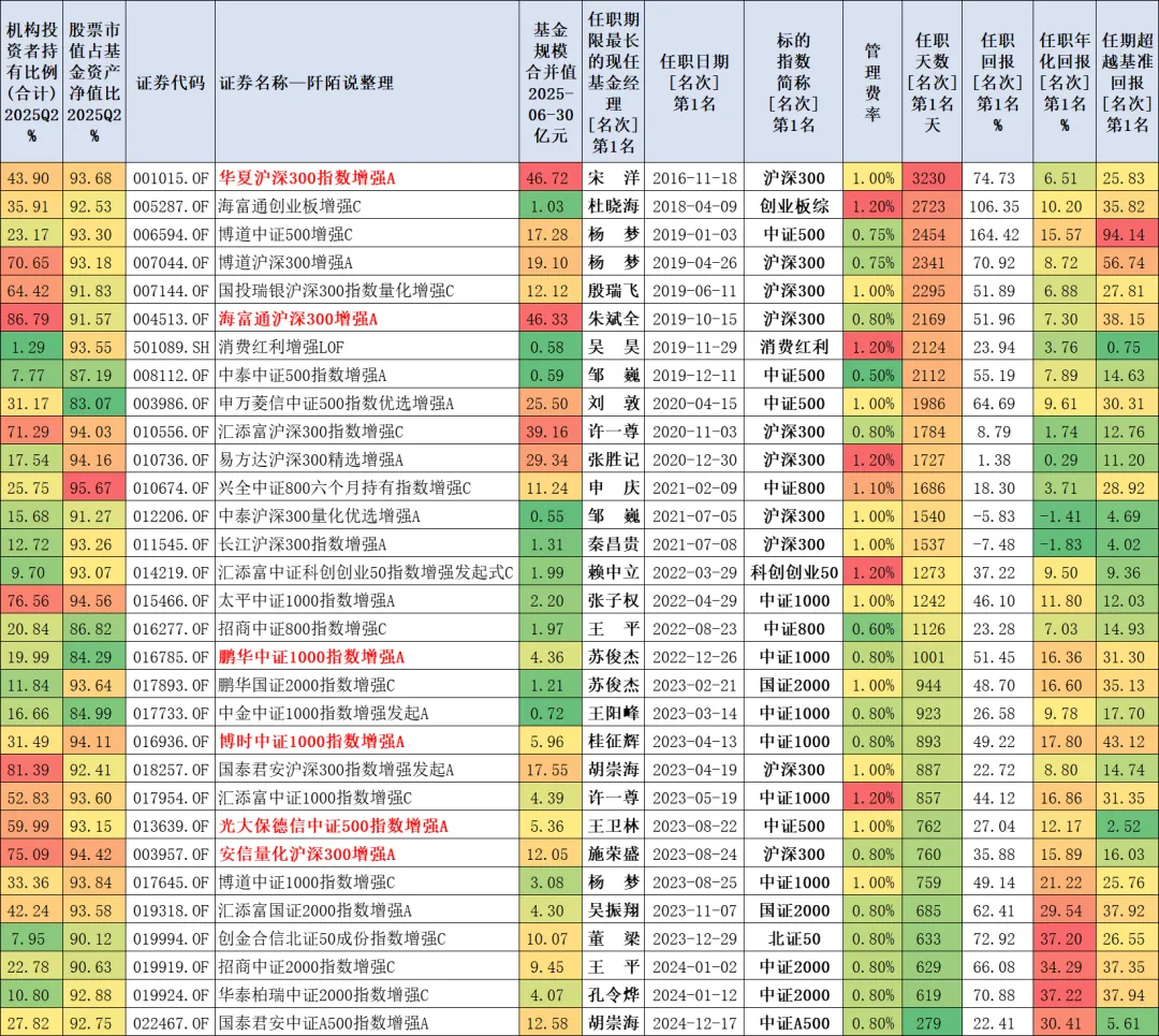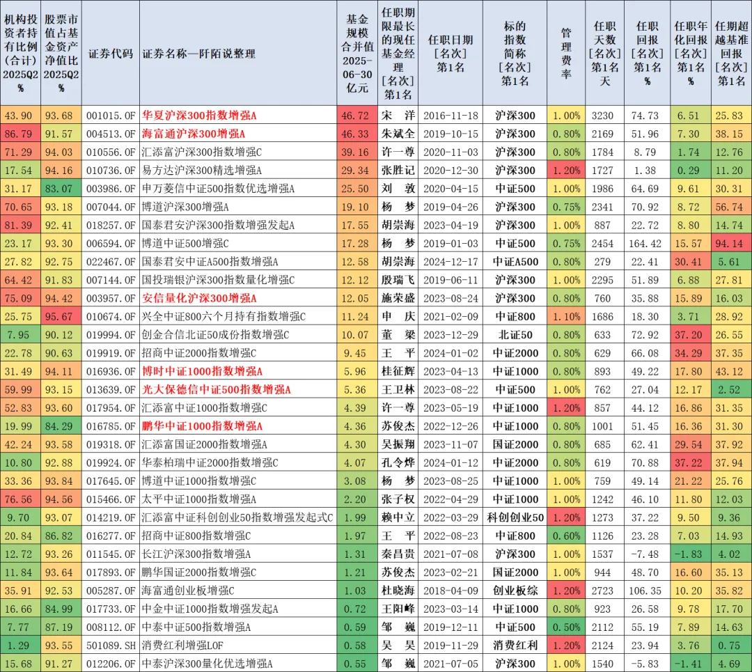 篇幅关系,本文只分享增强指数型基金吧,只有37只,多份额仅保留A类则是31只,其中有6只A/C同时上榜了,这6只基金名称被我标红了,详见下表: