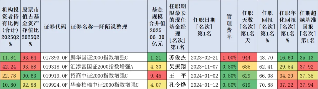 4、2只国证2000、2只中证2000指数增强基金单独展示如下,上榜的是苏俊杰、吴振翔、王平、孔令烨的基金。