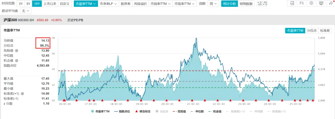 看了一下估值,根据WIND数据,截至2025年9月25日,沪深300指数的市盈率TTM=14.13倍,处于近十年估值百分位86.3%的位置(有点高了);市净率=1.47倍,处于近十年估值百分位51.47%的位置(这个位置还在中枢值附近);股息率2.57%,处于近十年估值百分位62.43%的位置(股息率百分位越高越好)。从市净率和股息率来看,不算特别贵,还是有一定性价比的。