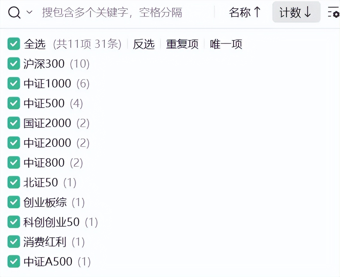 6、创业板综、消费红利、科创创业50、北证50、中证A500五只指数均只有1只基金上榜。