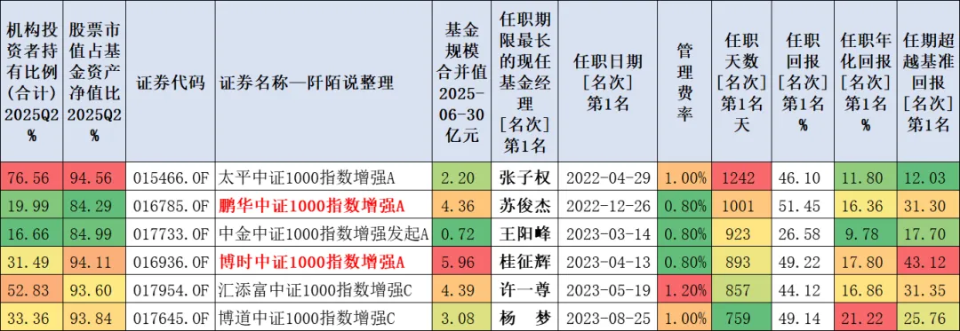 2、6只中证1000指数增强基金单独展示如下,上榜的基金经理有孙子权、苏俊杰、王阳峰、桂征辉、许一尊、杨梦。