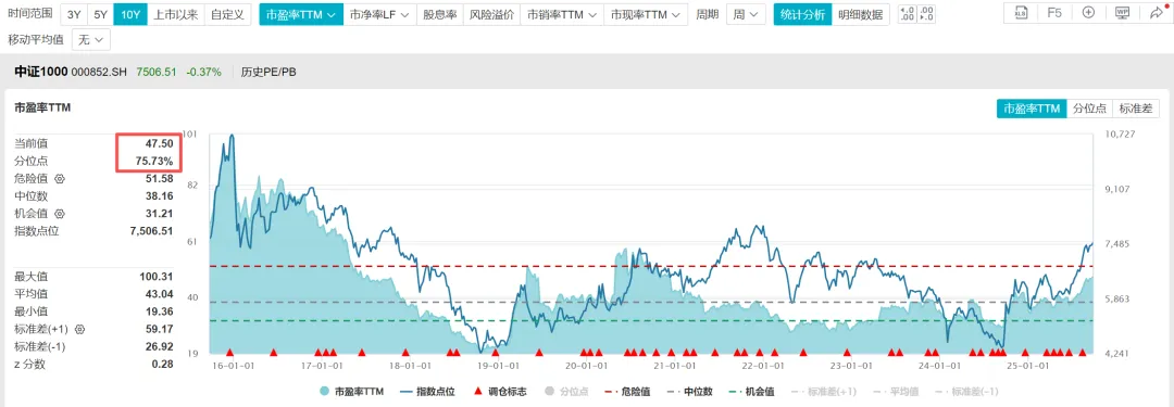 根据WIND数据,截至2025年9月25日,中证1000指数的市盈率TTM=47.50倍,处于近十年估值百分位75.73%的位置;市净率=2.52倍,处于近十年估值百分位53.23%的位置;股息率1.12%,处于近十年估值百分位61.84%的位置。从市净率和股息率来看,不算特别贵,还是有一定性价比的。
