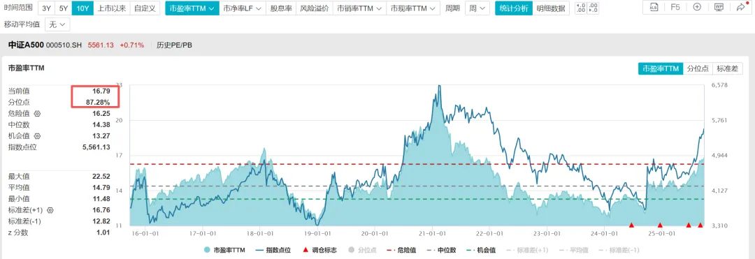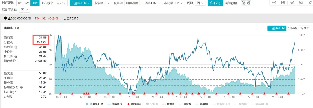 根据WIND数据,截至2025年9月25日,中证500指数的市盈率TTM=34.89倍,处于近十年估值百分位83.95%的位置;市净率=2.32倍,处于近十年估值百分位75.54%的位置;股息率1.36%,处于近十年估值百分位48.73%的位置。中证500指数当前看已经不算很便宜了。