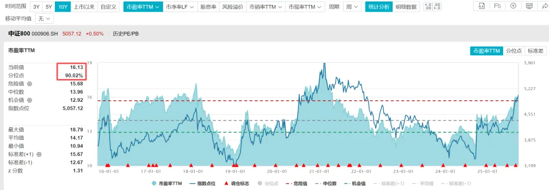 根据WIND数据,截至2025年9月25日,中证800指数的市盈率TTM=16.13倍,处于近十年估值百分位90.02%的位置;市净率=1.59倍,处于近十年估值百分位57.14%的位置;股息率2.28%,处于近十年估值百分位61.45%的位置。中证800指数=沪深300+中证500,市净率和股息率来看,不算特别贵,但市盈率已经到了高位。