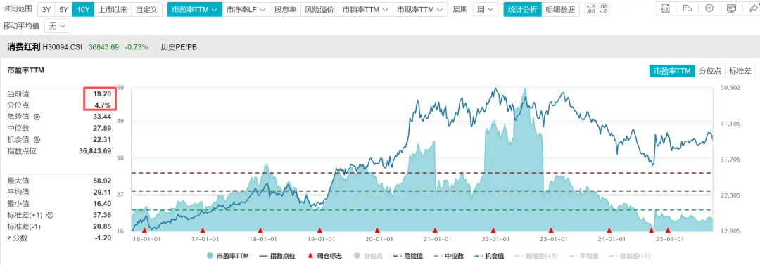 6.2、根据WIND数据,截至2025年9月25日,消费红利指数的市盈率TTM=19.20倍,处于近十年估值百分位4.7%的位置;市净率=4.41倍,处于近十年估值百分位21.92%的位置;股息率3.81%,处于近十年估值百分位93.15%的位置。
